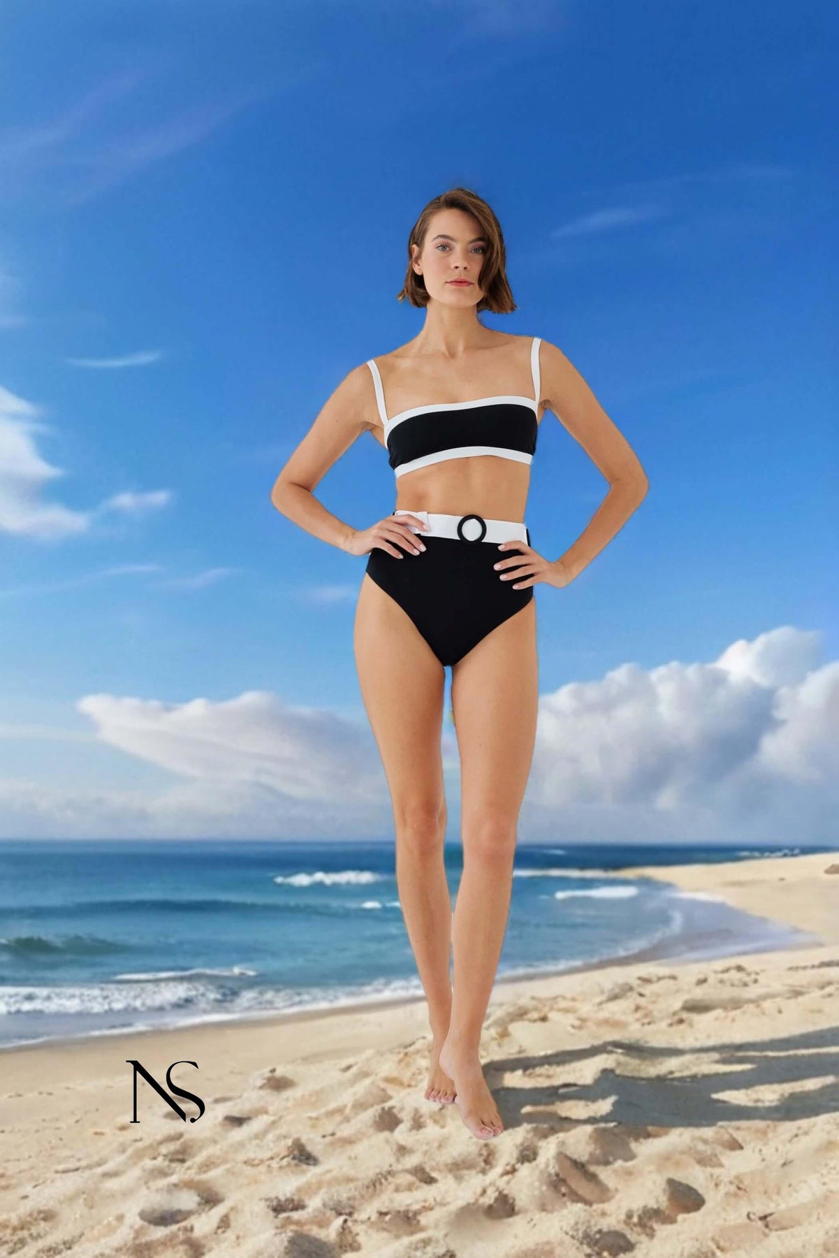 Experience chic Parisian style with our Cara Top-Shan Bottom Bikini Set. Featuring a bandeau bikini top and vintage-inspired bottom. The black and white contrast adds a touch of elegance to your summer voyage from our Illa Mare Collection.